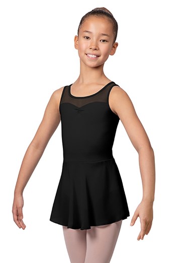 Onze balletpakjes met rok voor meisjes hebben een hoge ronde halslijn met een open achterkant en meshpanelen aan de voor- en achterkant.